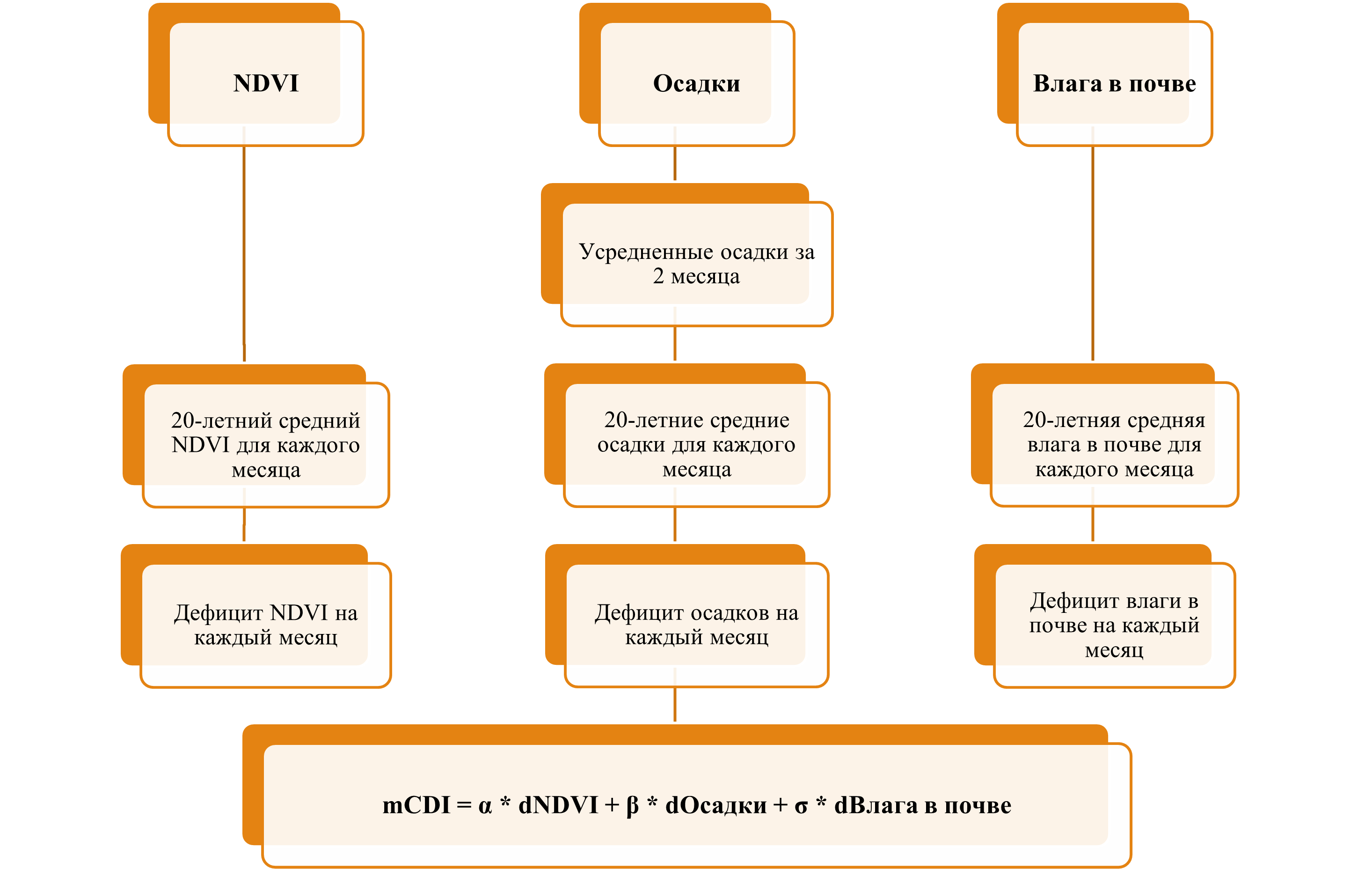 Сельскохозяйственная засуха возникает, когда урожайность сельскохозяйственных культур ниже нормы из-за длительного недостатка влаги в почве в корневой зоне из-за меньшего, чем обычно, количества осадков (Vyas et al., 2015). В этом исследовании использовались три продукта дистанционного зондирования: NDVI, осадки и влажность почвы, которые отражают, соответственно, интенсивность растительности и основное водообеспечение почвы в течение вегетационного периода. Сельскохозяйственная засуха отслеживалась и прогнозировалась с использованием модифицированного комбинированного индекса дефицита (mCDI), основанного на месячном дефиците NDVI, осадков и влажности почвы. Все входные параметры за 20-летний период доступны на странице "Исторические данные".